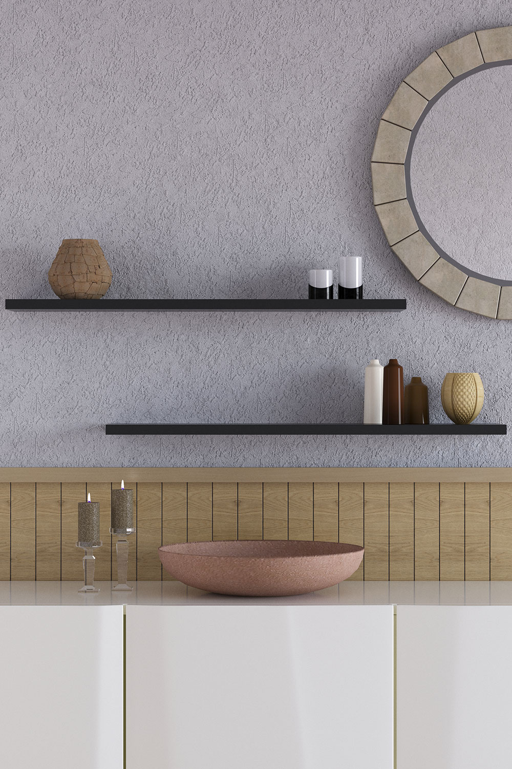 Raflar, duvara gizli bağlantı aparatları ile kolaylıkla monte edilmektedir. Böylece hiçbir bağlantı elemanı (vida, dübel) görünmez.